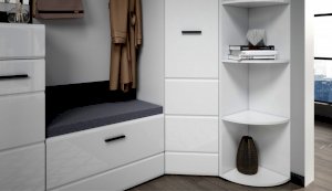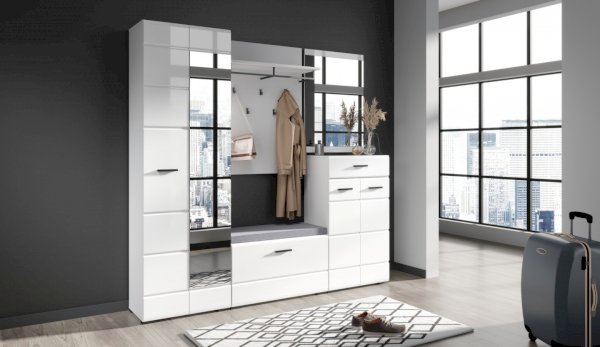 Прихожая Йорк выполнена в современном стиле – сочетает в себе функциональность и эффектный внешний вид: строгая горизонтальная фрезеровка фасадов, контрастные черного цвета ручки и задняя стенка из ХДФ. Глянцевые белые фасады High Gloss из МДФ и зеркала наполняют помещение светом, делают ее ярче и просторнее. Компактная и вместительная, с небольшой глубиной модулей, она поможет правильно организовать систему хранения даже в небольшом помещении.