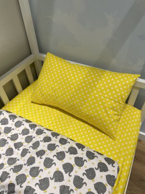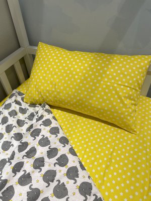 Весёлый комплект подойдёт любому возрасту и полу детей. А добрые слоники будут оберегать сон вашего ребёнка.