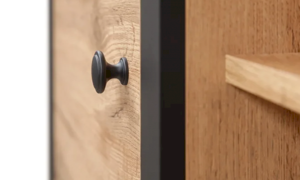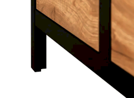 3 отделения: 1 выдвижной ящик на металлических  направляющих, открытое отделение и отделение за распашной глухой дверью. Матовая декоративная планка имитирует металл. Высокие ножки - это стильно и функционально. Ярко выраженная древесная текстура