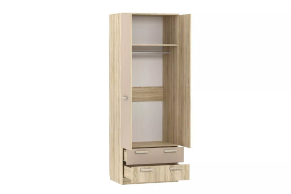 Внутри модуля предусмотрены овальная штанга для одежды на вешалках. Широкая антресольная полка подойдёт для размещения коробок и аксессуаров. Плавный и бесшумный ход, у двух выдвижных ящиков, обеспечивают шариковые направляющие полного цикла. Благодаря им, равномерно распределяется вес содержимого ящиков. Классические глухие фасады надежно защитят содержимое шкафа от влаги и пыли.