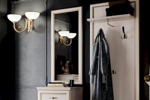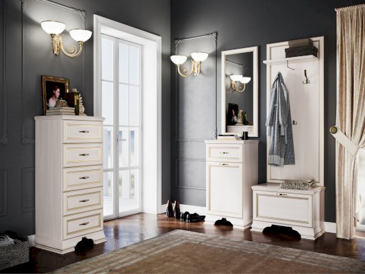 Классический стиль модели подчеркнут декоративным профилем МДФ с золотой патиной. Корпус под зеркальным полотном изготовлен из ЛДСП.