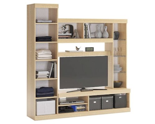 Состоит из: место под телевизор, витрина со стеклом, 4 шкафа с дверцами, открытые полки для аксессуаров, ниши под аудио-, видеотехнику.