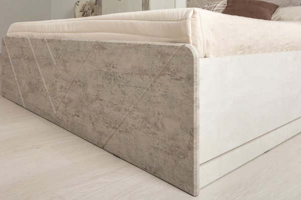 Мягкое изголовье и изножье кровати выполнено из экокожи, что гарантирует комфорт при эксплуатации и легкость в уходе. Декоративная прострочка повторяет общий мотив всей коллекции.