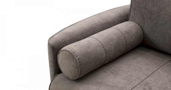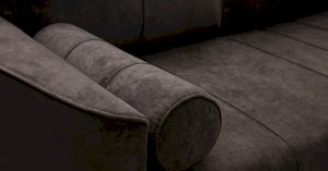 Кант на торцах приспинyых подушек, сиденья и подлокотников. Защипы на сиденье и приспинных подушках. Две декоративные подушки-валика с защипами.
