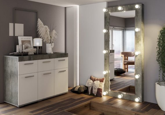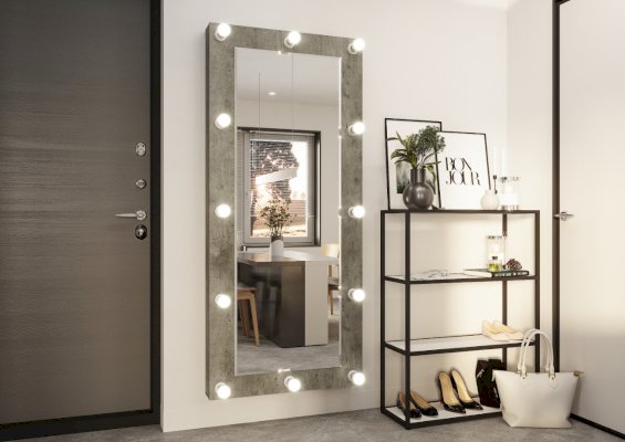 Большое зеркало Инстайл – это предмет интерьера, который помимо своей основной функции, позволит вам визуально расширить пространство и привнести больше света в помещение. Модель можно разместить в любой комнате, как вертикально, так и горизонтально. Рама зеркала изготовлена из ЛДСП в цвете бетон и дополнена по всему периметру лампочками с выключателем.