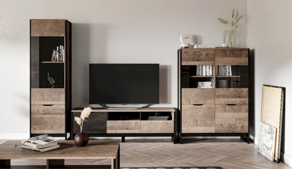 Шкаф-витрина со стеклянным фасадом – современное решение для гостиной или прихожей в стилях лофт, сканди, эко-минимализм. За стеклом размещены полки для предметов интерьера или красивой посуды. Нижнее отделение с глухим фасадом служит для хранения личных вещей. Отсутствие лицевой фурнитуры подчеркивает минимализм и геометрию модуля. Особенность дизайна – это сочетание реалистичных по цвету и тактильности трендовых декоров, которые соответствуют последним городским тенденциям. «Дуб Гранж» привлекает имитацией вручную обработанного дерева и выразительной зернистой текстурой, характерной формой досок. Стильный серый цвет «Железного камня» с металлическими разводами и новая текстура состаренной штукатурки в сочетании с гладкостью металла вносят индустриальныи? колорит. Оригинальные ножки-опоры из МДФ контрастного цвета придают изюминку, а светодиодная подсветка усилит впечатление от созданного интерьера.
