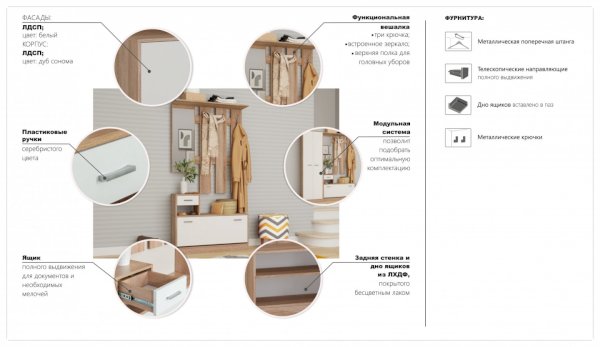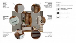 Интер – современная прихожая в стиле минимализм - минимум декора, максимум функционала. Компактная и вместительная, с небольшой глубиной – она поможет правильно организовать пространство в небольшом помещении. Прихожая включает в себя необходимые модули: вешалка с крючками, вместительные обувницы, выдвижные ящики для мелочей, зеркало и двухстворчатый шкаф с выдвижной вешалкой и полками. Модное сочетание нейтральных цветов дуба сономы и белого наполнит комнату теплым и мягким светом, визуально увеличит пространство. Прихожая подойдет тем, кто любит практичность и разумность. Хорошо сочетается с модулями системы Стелс.