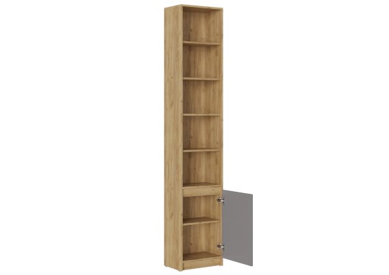 Верхняя часть стеллажа поделена на 5 равных отсеков несъемными полками. Нижняя часть закрывается фасадом. За створкой несъёмная полка, разделяющая пространство на 2 равные части. Над фасадом зазор 32 мм для отрывания.