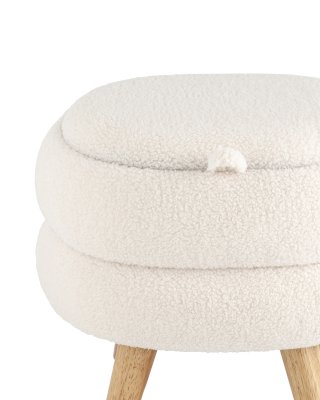 Круглый пуф Винни в скандинавском стиле. Обивка выполнена из ткани тедди - очень мягкий и приятный на ощупь материал. Прочный каркас из фанеры выдерживает нагрузку до 150 кг. Вместительный ящик для хранения мелочей внутри обит плотной тканью. Благодаря двухсторонней крышке, пуф можно трансформировать в журнальный столик. Столешница выполнена из светлого дерева. Ножки из светлого массива дерева гармонично сочетаются с белой обивкой. Пуф Винни отличный вариант для спальни, детской и прихожей.