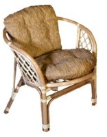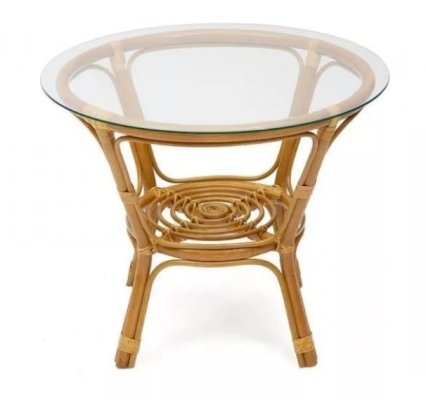 Комплект из натурального ротанга, состоящий из двух кресел и круглого столика с плетеной столешницей. Стекло входит в комплект.