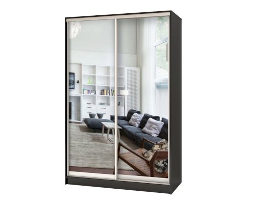 Данное изображение представлено в следующих цветах: корпус - Венге Цаво, фасады - зеркало, рамка двери и треки - Серебро матовое.