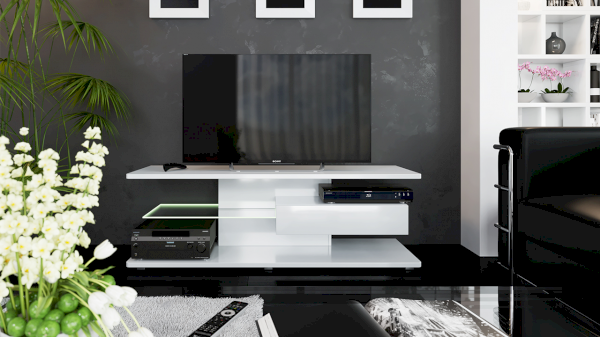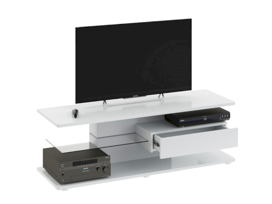 Тумба ТВ оснащена открытыми полками, выдвижным ящиком и широкой поверхностью подставки под телевизор. Ящик тумбы оборудован системой полного выдвижения, благодаря чему обеспечивается доступ к внутреннему пространству.