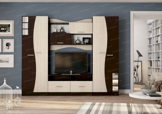 Гостиная «Рио» делает обстановку менее традиционной и более раскованной. Уникальный дизайн удивляет и завораживает! Оригинальное цветовое решение, несколько плавных линий и небольшие зеркальные вставки превращают самую обычную модель в центральный элемент интерьера. Безупречный внешний вид гарнитура обеспечивает ламинированное покрытие естественных оттенков с хорошо различимой текстурой натурального дерева.
