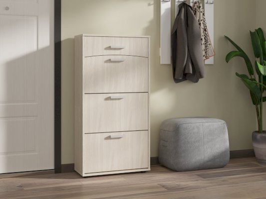 Тумба оснащенная тремя отделениями для обуви и одним выдвижным ящиком полного выдвижения. Она прекрасно подходит для современной обстановки.