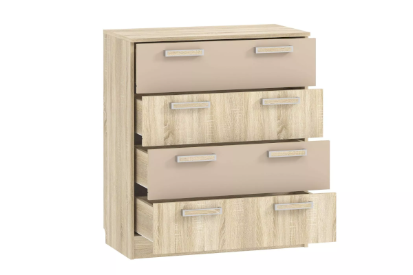 Комод «Акварель» -  прекрасный выбор для тех, кто любит практичность и комфорт. Комод обладает модным сочетанием материалов, цветов и подчеркивает настроение детства – радость новизны и жажду открытий. Четыре удобных выдвижных ящика – это огромный объем  для хранения белья, предметов одежды и аксессуаров.