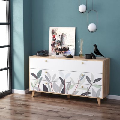 Принт на фасадах комода создан нашими дизайнерами вручную. Рисунок нанесен при помощи технологии УФ-печати. Принты не выцветают со временем и устойчивы к механическому воздействию.