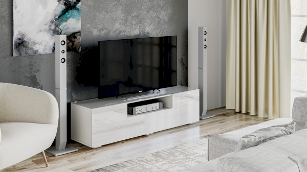 Тумба ТВ оснащена открытой полкой, выдвижным ящиком и широкой поверхностью подставки под телевизор. Дверные фасады боковых отсеков оборудованы накладными петлями с доводчиками, что обеспечивает плавное бесшумное закрытие.